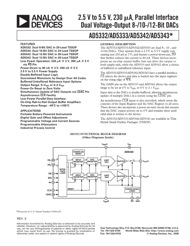 AD5342: +2.5V to 5.5V, 230 A Dual Rail-to-Rail Voltage Output 12-Bit DAC with Parallel Interface in 28-lead TSSOP