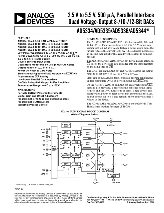 AD5344: +2.5V to 5.5V, 500A Quad Rail-to-Rail Voltage Output 12-Bit DAC with Parallel Interface in 28-lead TSSOP