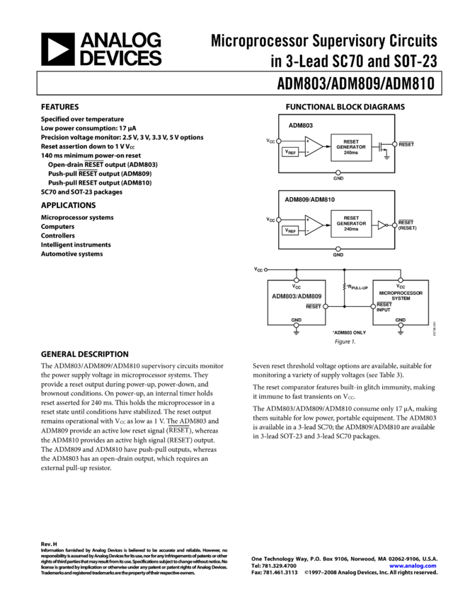 ADM810: Microprocessor Supervisory Circuit in 3-Lead SOT-23 & SC70, Active-High Push-Pull Output