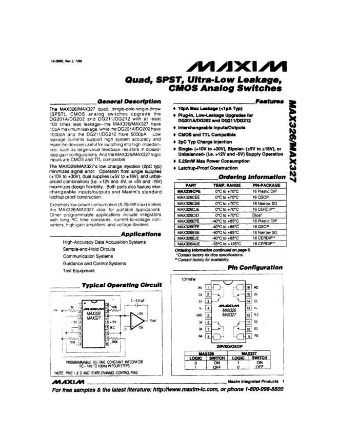 MAX326, MAX327 Quad, SPST, Ultra-Low-Leakage, CMOS Analog Switches