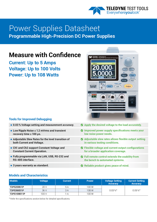 Zasilacz laboratoryjny regulowany Teledyne LeCroy T3PS20051P 0 - 20 V 0 - 5 A 100 W