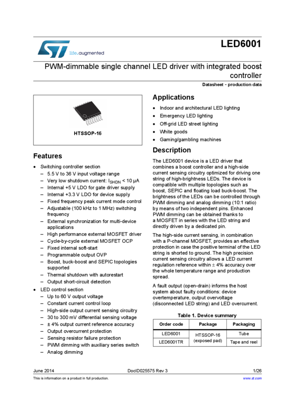 1 A, up to 60V Vin, buck LED driver board based on the LED6000