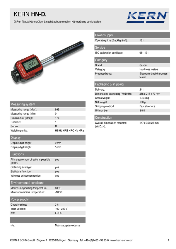 Twardościomierz Sauter HK-DB Leeba 170 - 960 HL
