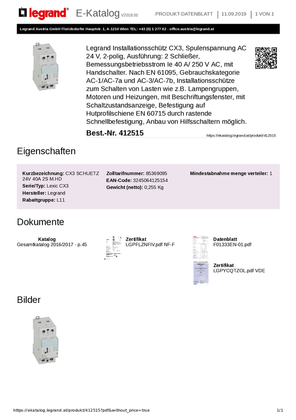 Legrand Legrand 412515 Stycznik instalacyjny 2 NO 24 V 40 A 1 szt.
