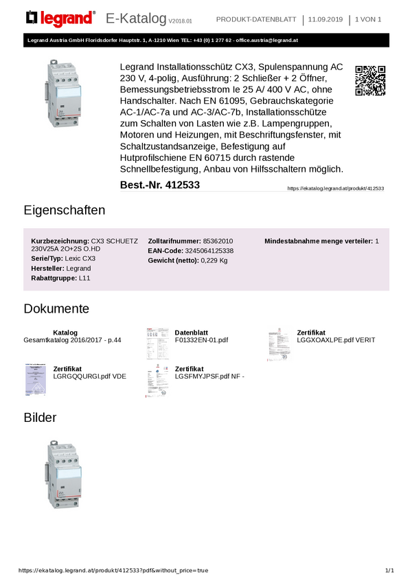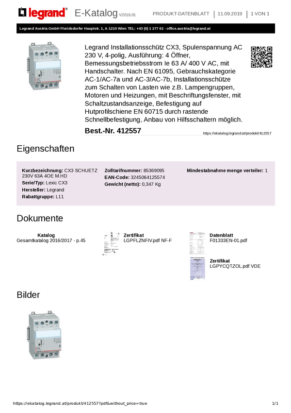 Stycznik instalacyjny Legrand Legrand 412557 412557, 4 styki, 230 V, 63 A, 1 szt.
