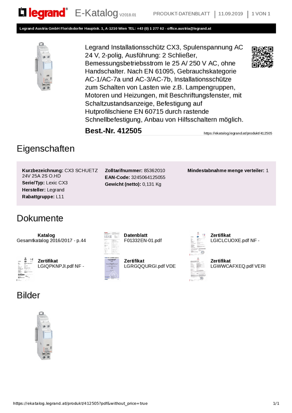 Stycznik instalacyjny Legrand Legrand 412517 412517, 4 styki, 24 V, 25 A, 1 szt.