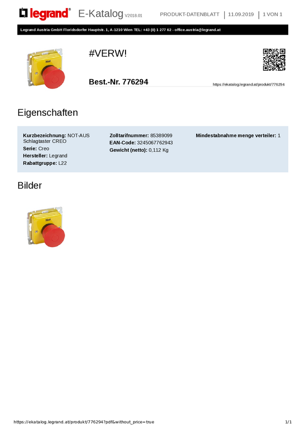 Przycisk zatrzymania awaryjnego Legrand Legrand 776198, 1 NC, 1 NO, 1 szt.