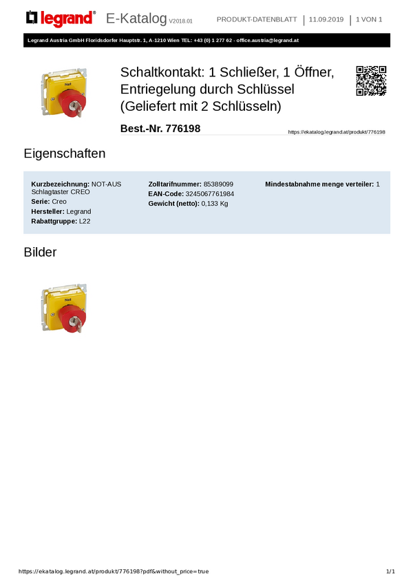 Wyłącznik awaryjny Legrand Legrand 776294, 250 V, 1 NC, 1 NO, 1 szt.
