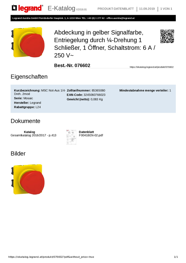 Legrand Legrand 076602 Przycisk zatrzymania awaryjnego 250 V 6 A 1 NC, 1 NO IP41 1 szt.