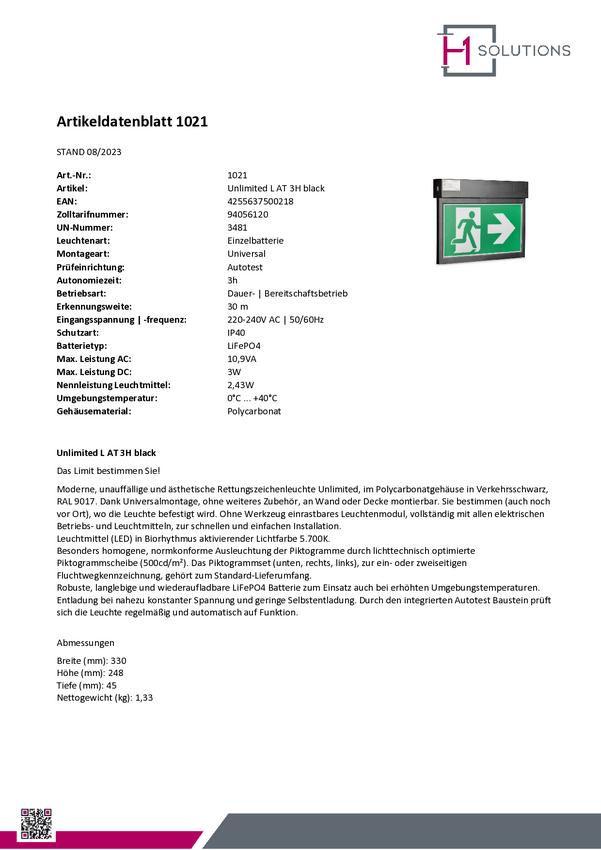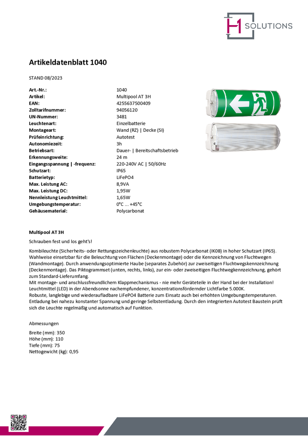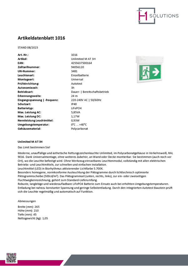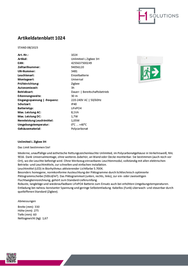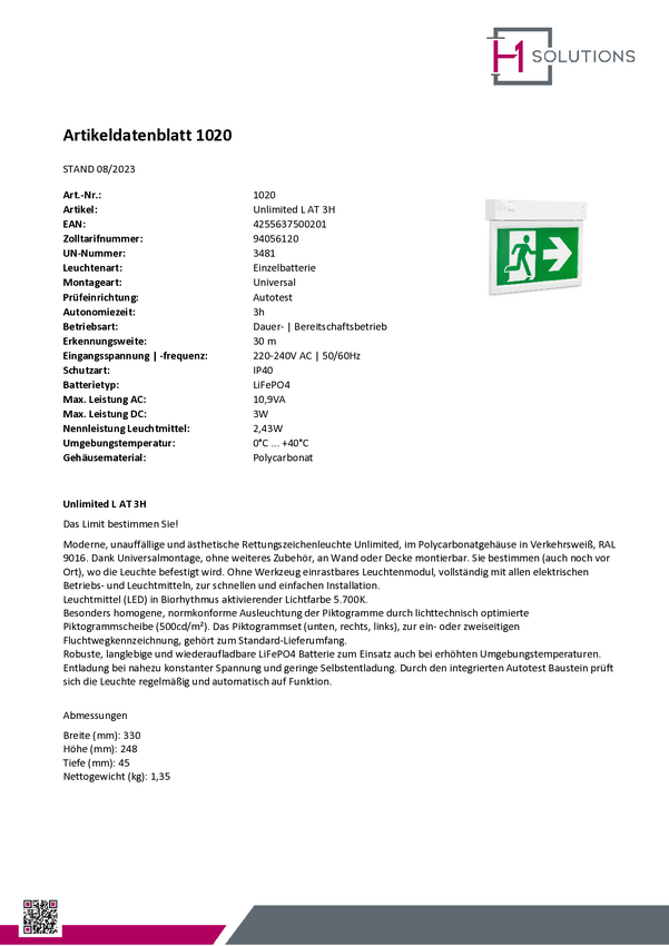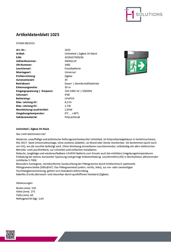 H1 Solutions 1040 Oznakowanie drogi awaryjnej z podświetleniem LED Montaż ścienny, Montaż sufitowy w prawo, w lewo, w dó
