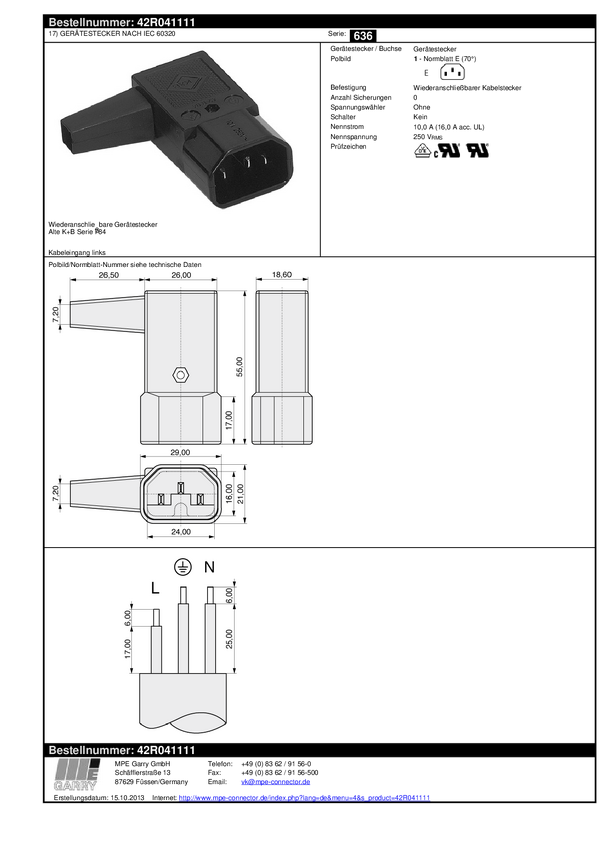 złącze męskie kątowe C14 2 + PE Wejście kabla z lewej strony 10 A czarny K & B 42R041111 1 szt.
