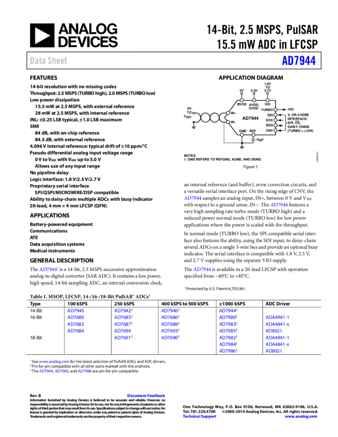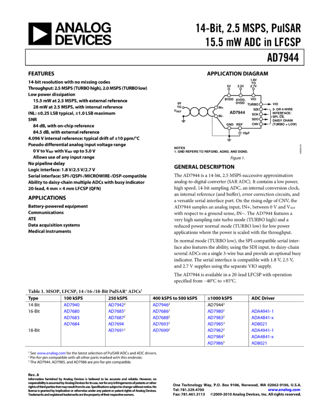 AD7944: 14-Bit, 2.5 MSPS, PulSAR 15.5 mW ADC in LFCSP