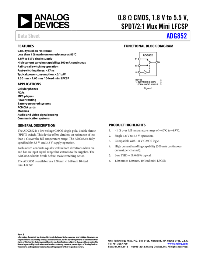 0.8 Ω CMOS, 1.8V to 5.5V, SPDT/2:1 Mux Mini LFCSP