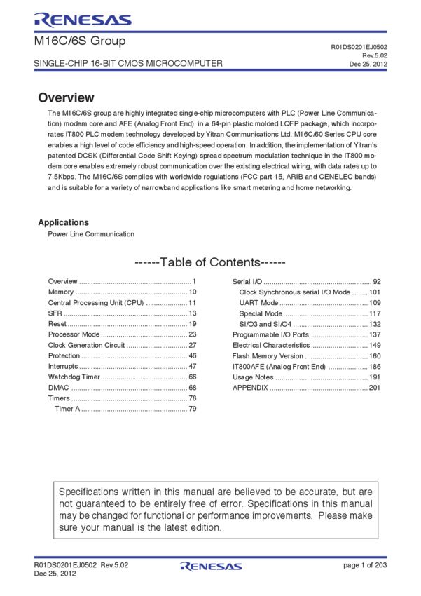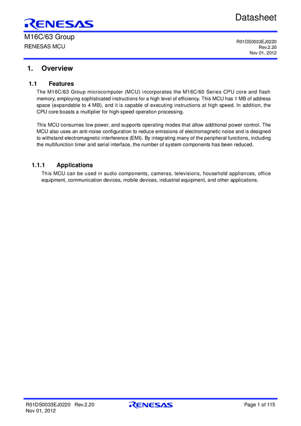 MCU 16-Bit M16C/63 M16C/60 CISC 400KB Flash 3.3V/5V 100-Pin LFQFP Tray