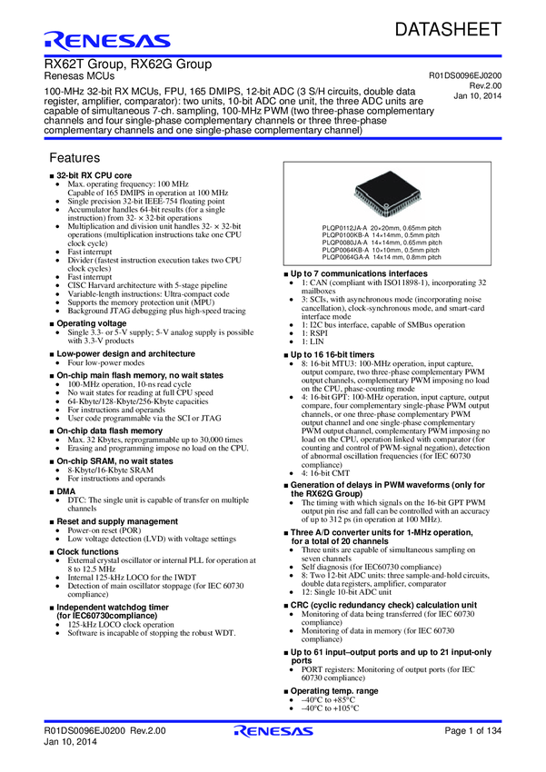 MCU 32-Bit RX62T RX CISC 64KB Flash 3.3V/5V 64-Pin LFQFP Tray
