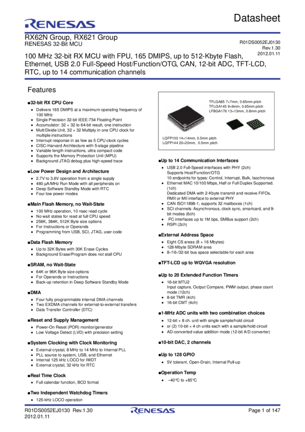 MCU 32-Bit RX62N RX CISC 512KB Flash 3.3V 100-Pin LFQFP Tray