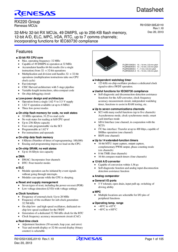 MCU 32-Bit RX220 RX CISC 128KB Flash 3.3V/5V 64-Pin LFQFP Tray