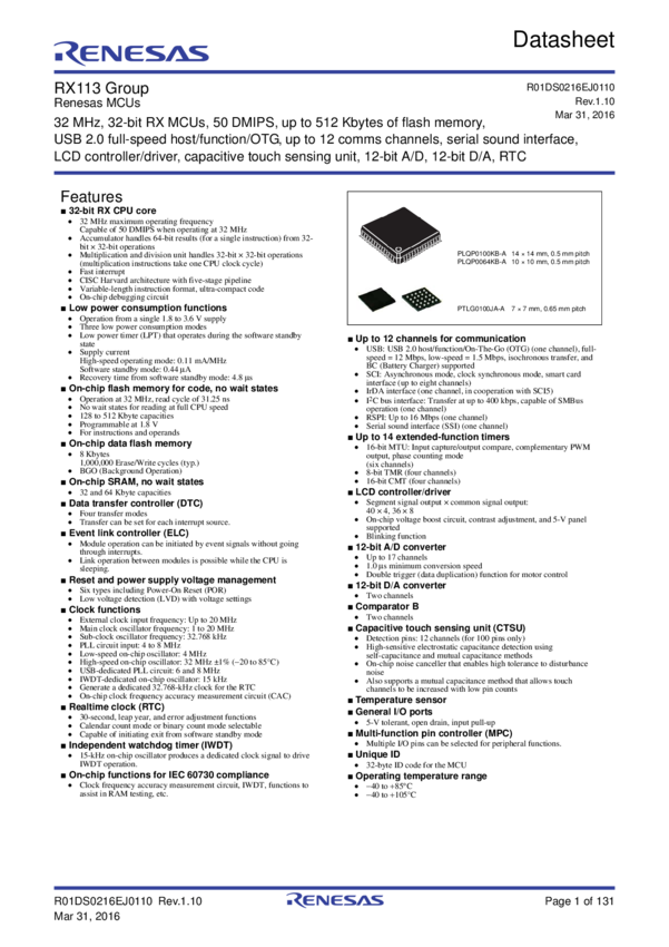 MCU 32-Bit RX113 RX CISC 512KB Flash 3.3V 100-Pin LFQFP Tray