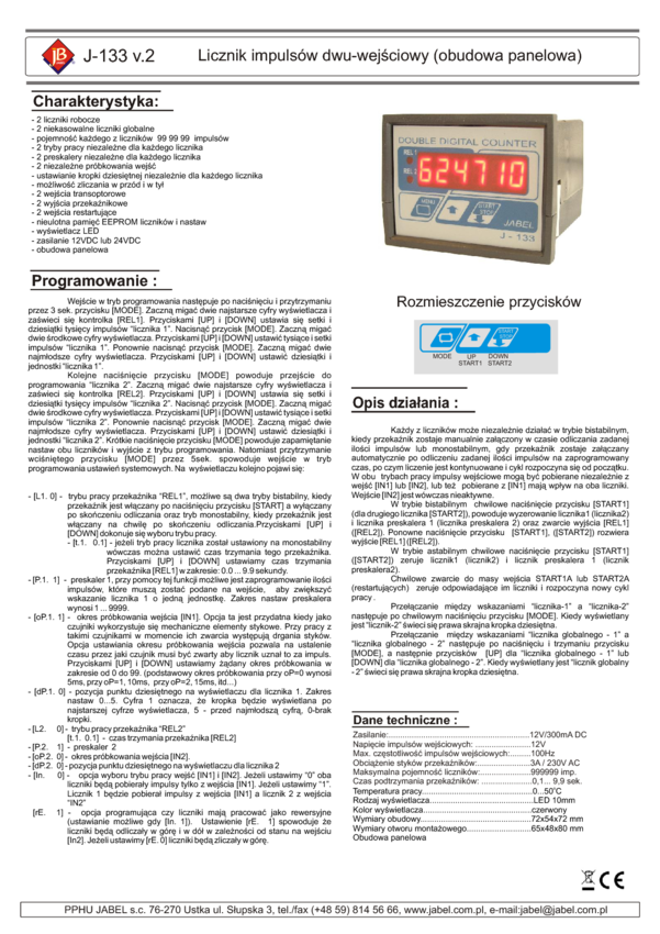 J-133 Licznik impulsów dwu-wejściowy (obudowa panelowa)