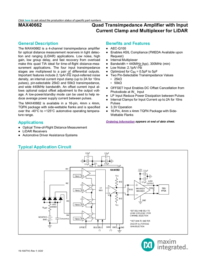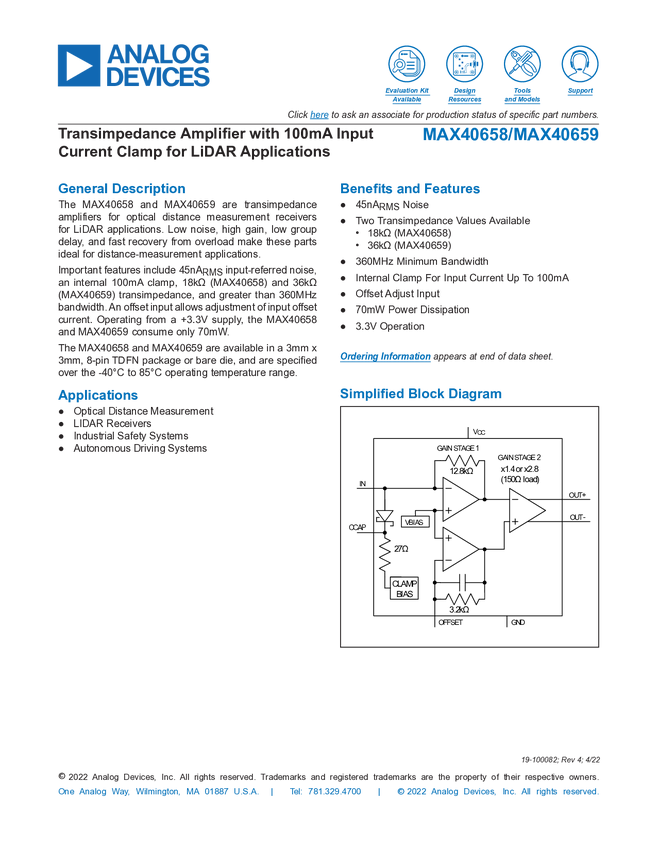 Transimpedance Amplifier with 100mA Input Current Clamp for LiDAR Applications