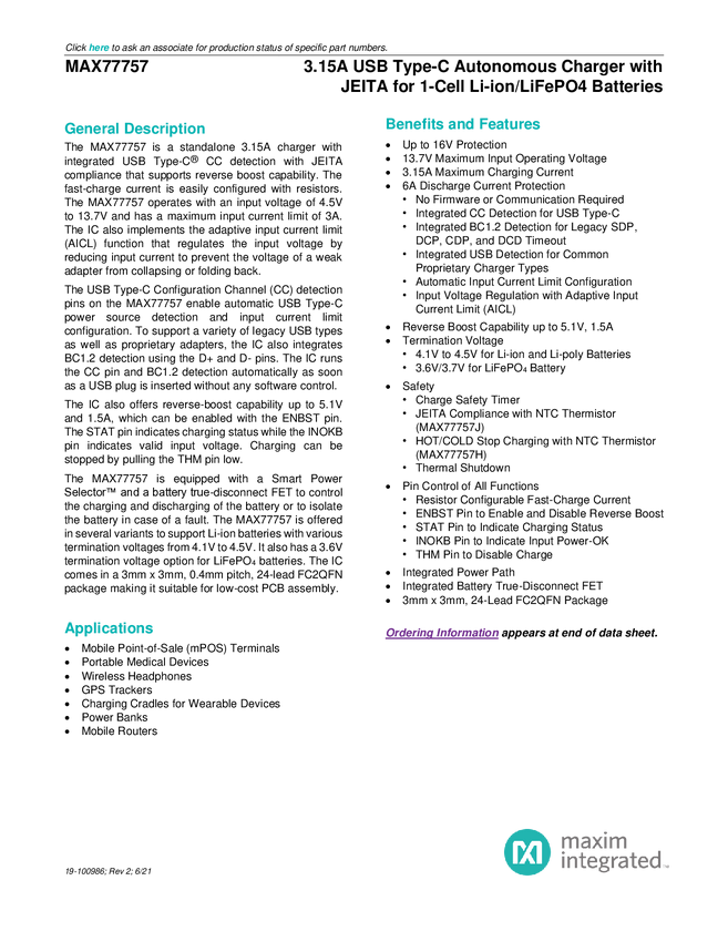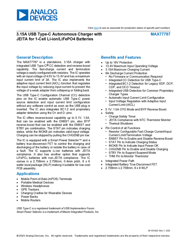 3.15A USB Type-C Autonomous Charger with JEITA for 1-Cell Li-ion/LiFePO4 Batteries