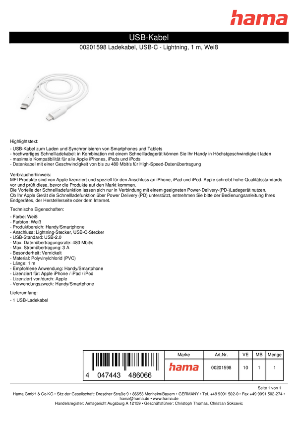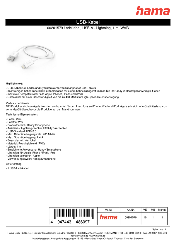 Hama Kabel do ładowania USB USB 2.0 Złącze męskie Lightning, Złącze męskie USB-A 1.00 m biały 00201579