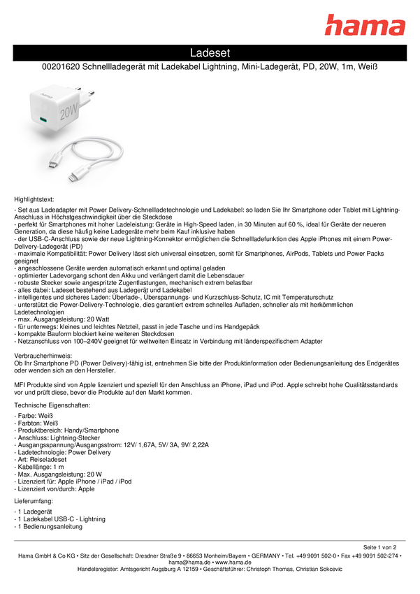 Hama Ładowarka USB 20.00 W 1x USB-C®, 1x Apple Lightning biały dom