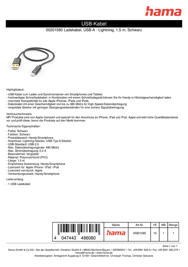 Hama Kabel do ładowania USB USB 2.0 Złącze męskie Lightning, Złącze męskie USB-A 1.50 m czarny 00201580