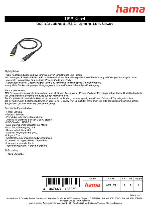 Hama Kabel do ładowania USB USB 2.0 Złącze męskie Lightning, Złącze męskie USB-C® 1.50 m czarny 00201602