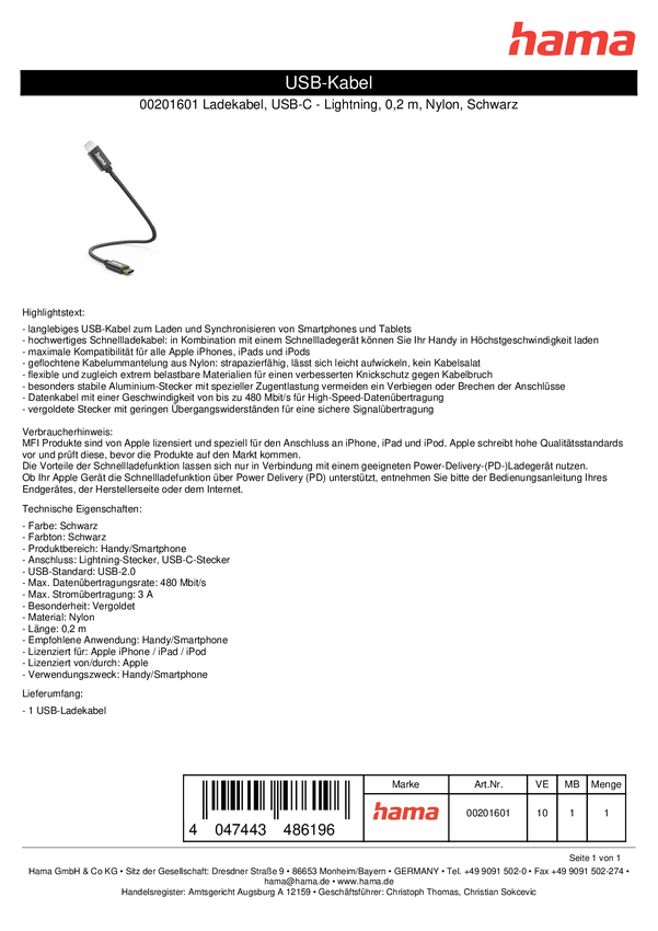 Kabel ładujący Hama, USB-A - Lightning, 0,2 m, nylon, czarny