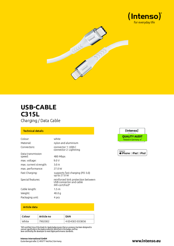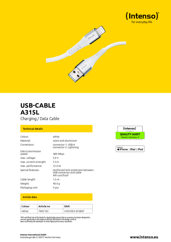 Intenso Kabel USB USB 2.0 Złącze męskie USB-A, Złącze męskie Lightning 1.50 m biały oplot materiałowy 7902102