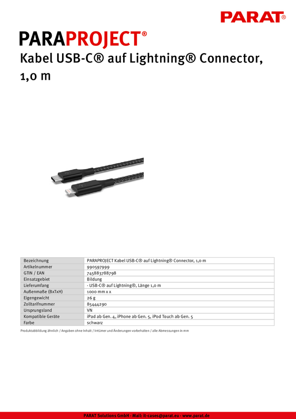 Parat Kabel USB Złącze męskie USB-C®, Złącze męskie Lightning 1.00 m czarny oplot materiałowy 990597999