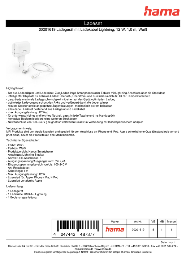 Hama Ładowarka USB 12.00 W 1x USB-A, 1x Apple Lightning biały dom