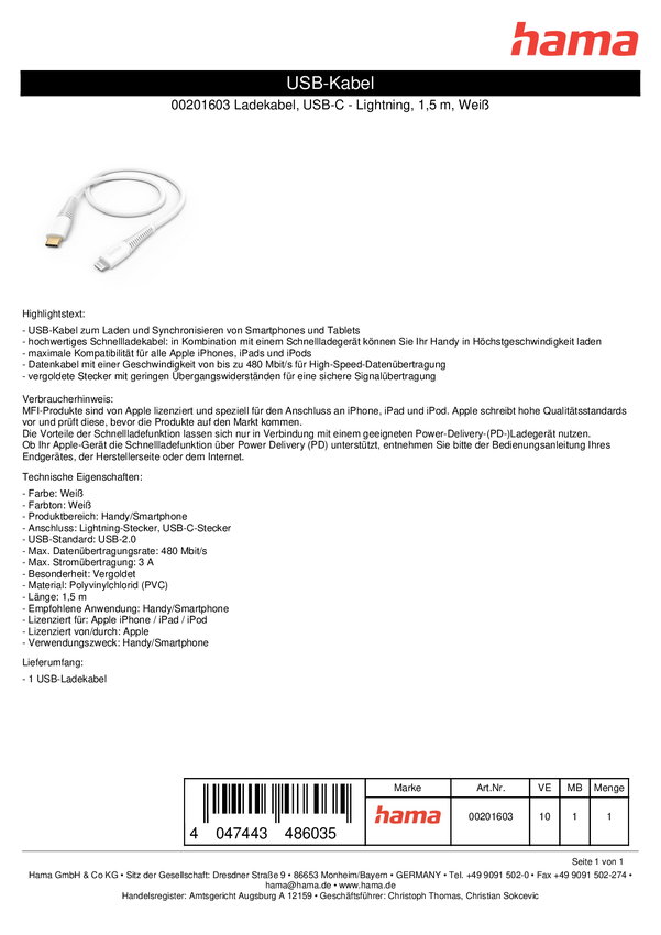 Hama Kabel do ładowania USB USB 2.0 Złącze męskie Lightning, Złącze męskie USB-A 1.50 m biały 00201581