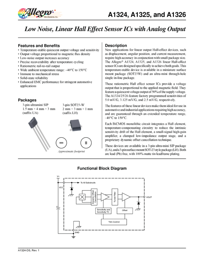 Czujnik Halla w postaci układu scalonego, liniowy, napięcie zasilania 4.5 - 5.5 V, napięcie spoczynkowe 50% Vcc, czułość 5 mV/g, pasmo wyjściowe 17 kHz, zakresy temperaturowe: L
