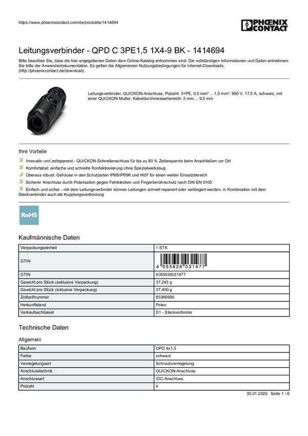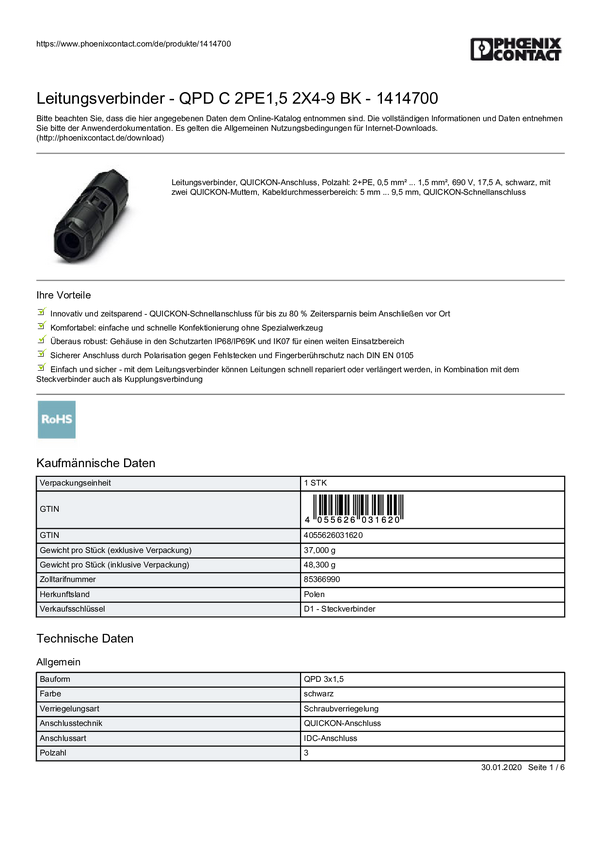 Phoenix Contact 1414699 Złącze liniowe QPD C 2PE1,5 1X4-9 BK, 1 szt.