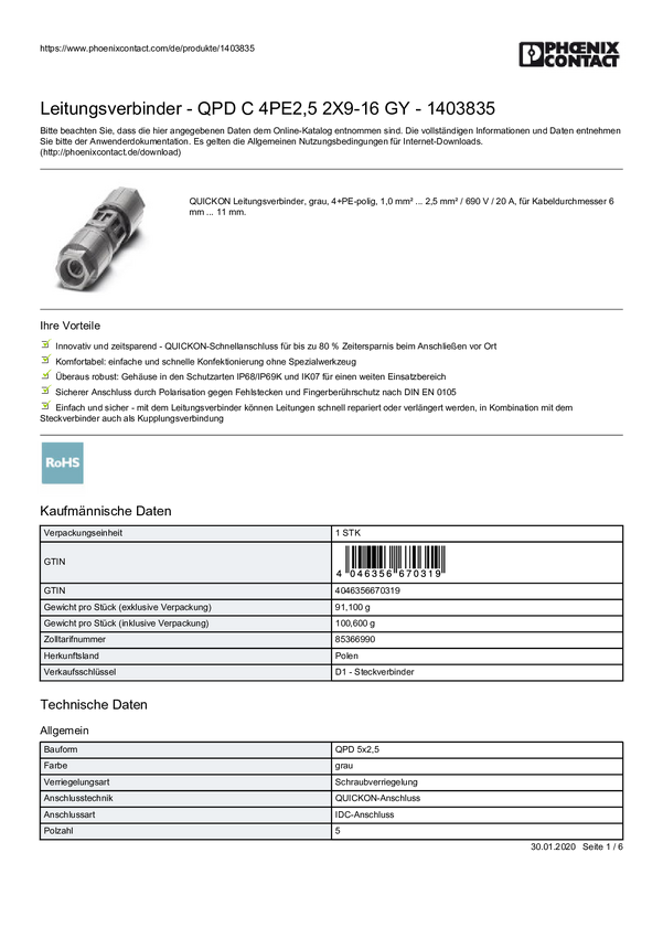 Phoenix Contact 1403837 Złącze liniowe QPD C 4PE2,5 2X6-11 GY, 1 szt.