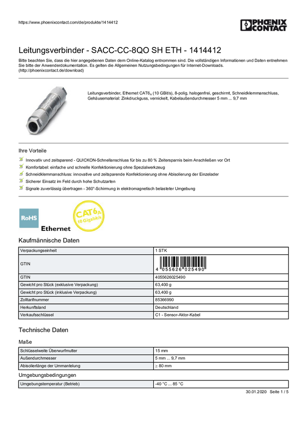 Phoenix Contact 1414412 Złącze liniowe SACC-CC-8QO SH ETH, 1 szt.