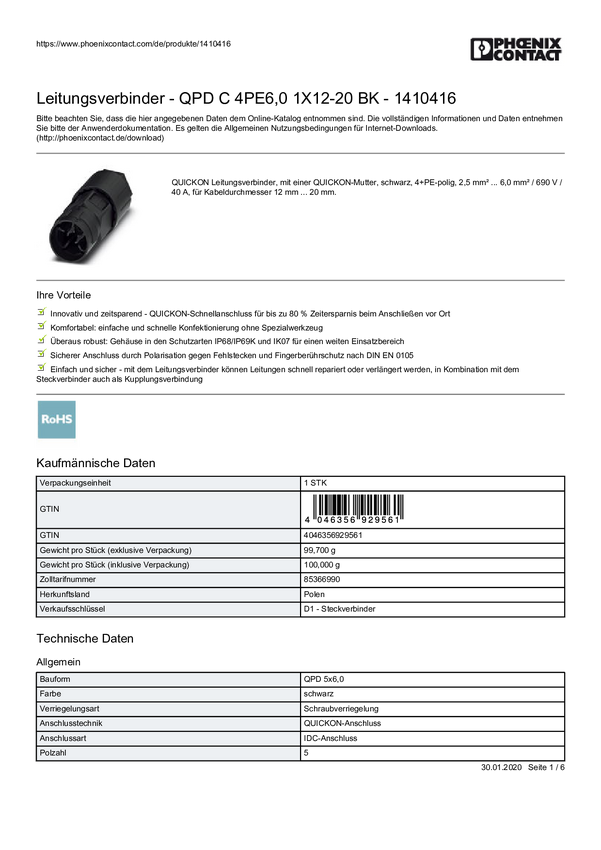 Phoenix Contact 1410415 Złącze liniowe QPD C 4PE6,0 1X9-14 BK, 1 szt.
