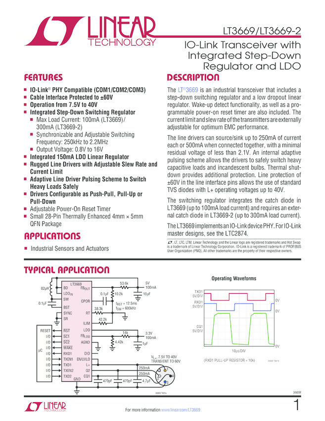 IO-Link Transceiver with Integrated Step-Down Regulator and LDO