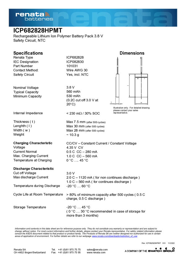 Akumulator specjalny Renata 101031, LiPo, 560 mAh, 3.7 V, 1 szt.