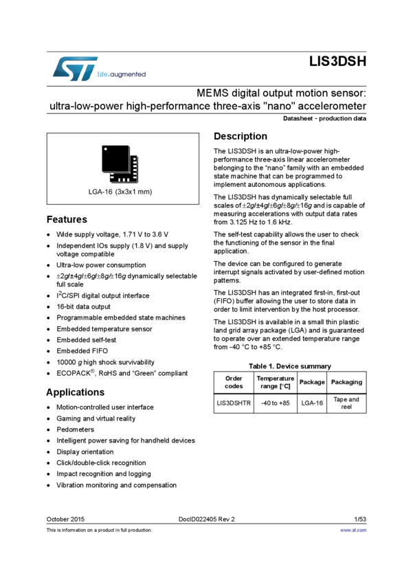 MEMS digital output motion sensor: ultra low-power high performance 3-axes nano accelerometer