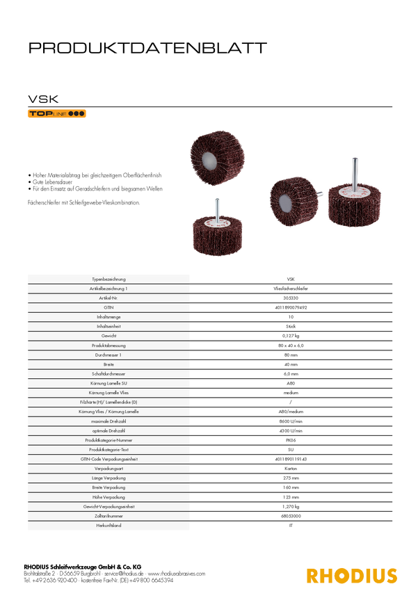 Rhodius 305329 RHODIUS VSK, 10 sztuk tarcz listkowych z włókniny 80 x 40 x 6,0 mm, A60, gruboziarniste, TOPline, do stal