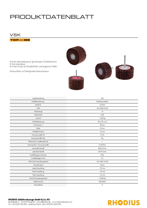 Rhodius 305333 RHODIUS VSK, 10 sztuk tarcz listkowych z włókniny 80 x 50 x 6,0 mm, A60, gruboziarniste, TOPline, do stal