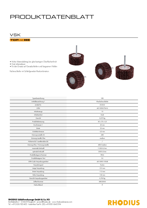 Rhodius 305317 RHODIUS VSK, 10 sztuk tarcz listkowych z włókniny 40 x 30 x 6,0 mm, A60, gruboziarniste, TOPline, do stal