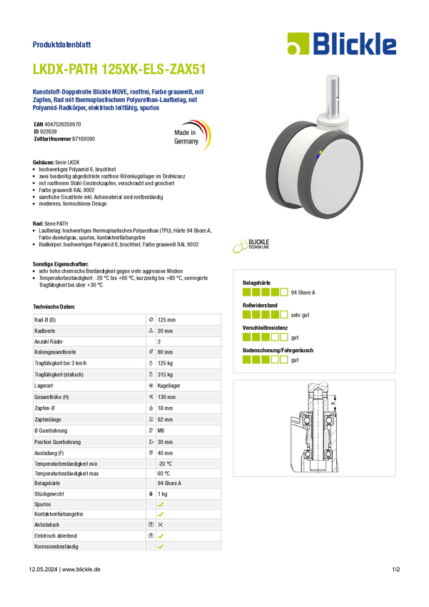 Blickle 922639 LKDX-PATH 125XK-ELS-ZAX51 Podwójna rolka z tworzywa sztucznego Średnica koła: 125 mm Maksymalne obciążeni
