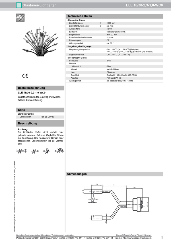 Pepperl+Fuchs 415629 Przewód światłowodowy LLE 18/30-2,3-2,0-Z1 1 szt.
