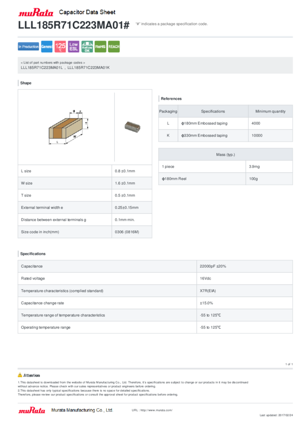 Cap Ceramic 0.022uF 16V X7R 20% SMD 0306 125°C Embossed T/R