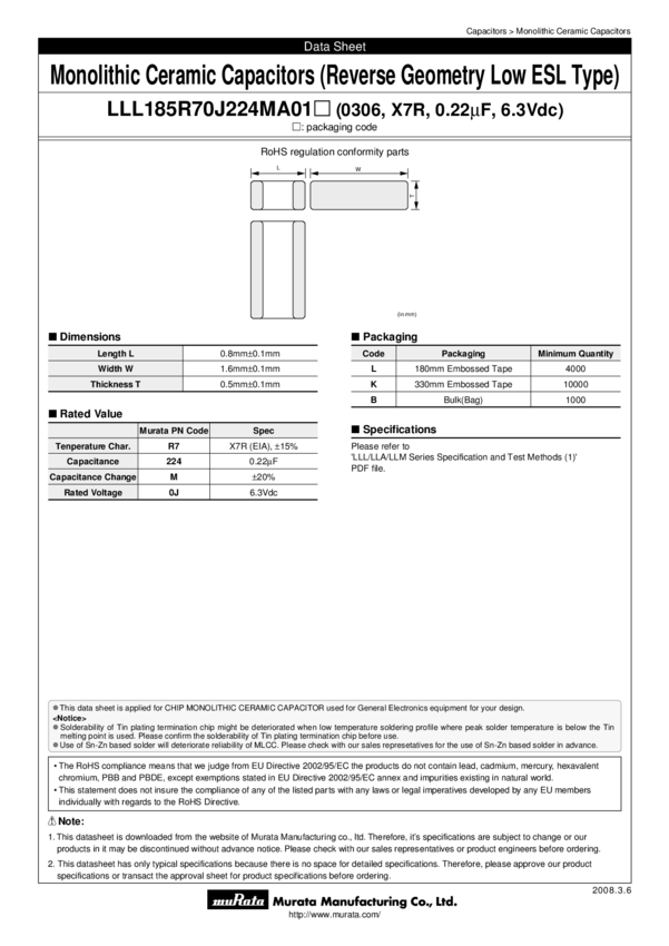 Cap Ceramic 0.22uF 6.3V X7R 20% SMD 0306 125°C Embossed T/R