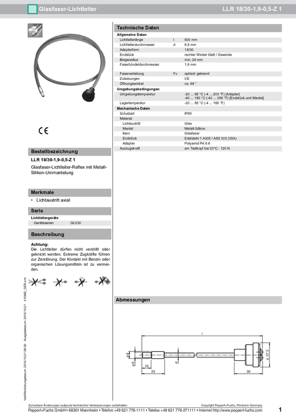 Pepperl+Fuchs 415682 Przewód światłowodowy LLR 18/30-1,9-0,5-Z 1 1 szt.